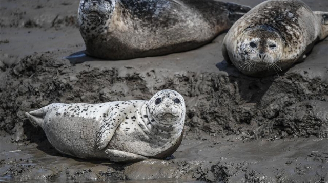 Spotted seals are seen on the coastal mudflat of Sandaogou in Panjin, northeast China's Liaoning Province, March 28, 2019. Over 120 spotted seals rest here and will head back to the Pacific regions in late May. (Xinhua/Pan Yulong)