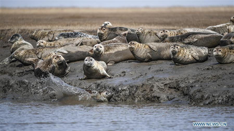 Spotted seals are seen on the coastal mudflat of Sandaogou in Panjin, northeast China's Liaoning Province, March 28, 2019. Over 120 spotted seals rest here and will head back to the Pacific regions in late May. (Xinhua/Pan Yulong)