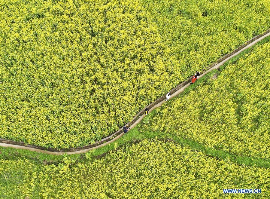 Aerial photo taken on March 28, 2019 shows tourists go sightseeing in the fields of cole flowers at Hunzhai Village of Zhujiachang Township in Tongren City, southwest China's Guizhou Province. (Xinhua/Hu Panxue)