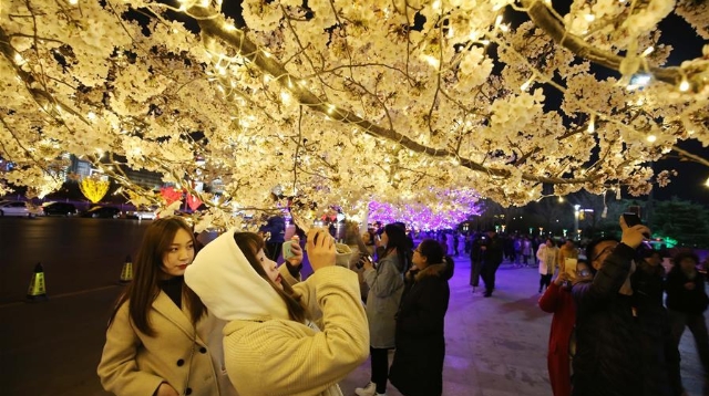 Photo taken on March 28, 2019 shows the cherry blossoms at night in Weifang City, east China's Shandong Province. (Xinhua/Zhang Chi)