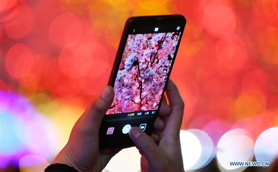 A visitor takes pictures of the cherry blossoms at night in Weifang City, east China's Shandong Province, March 28, 2019. (Xinhua/Zhang Chi)