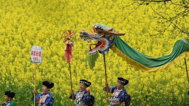 People of Miao ethnic group perform drum beating during a peach flower fair in Xinke Village, Xiangxi of central China's Hunan Province, March 31, 2019. (Xinhua/Long Enze)