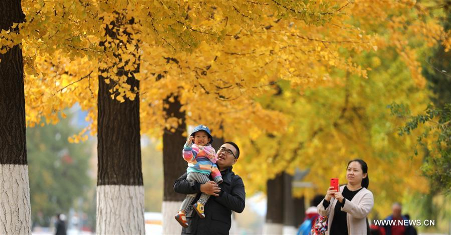 A tourist takes photos under the ginkgo trees in Dandong, northeast China's Liaoning Province, Oct. 28, 2019. (Xinhua/Yao Jianfeng)
