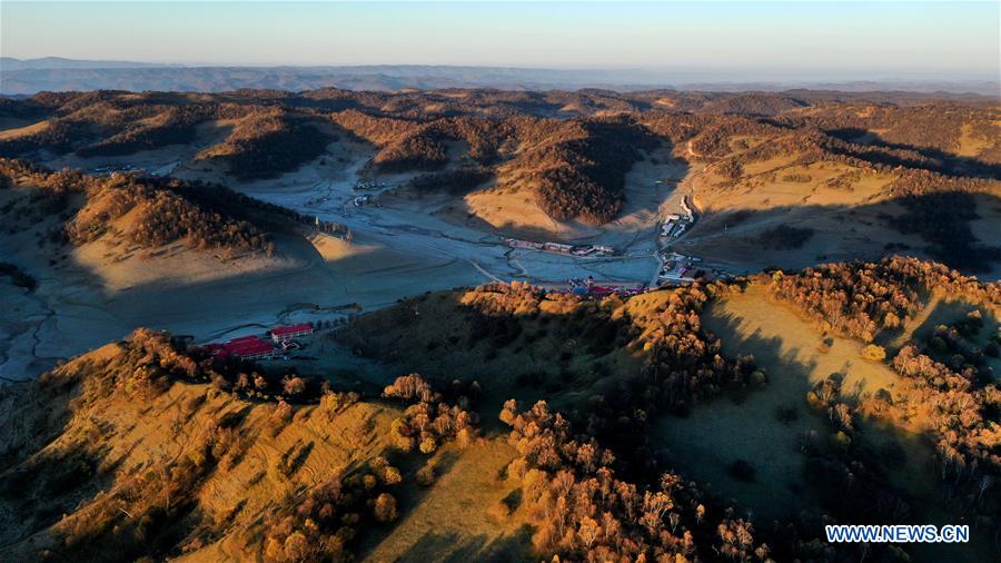 Aerial photo taken on Oct. 29, 2019 shows the sunrise scenery at Guanshan pasture in Longxian County, Baoji City, northwest China's Shaanxi Province. (Xinhua/Tao Ming)