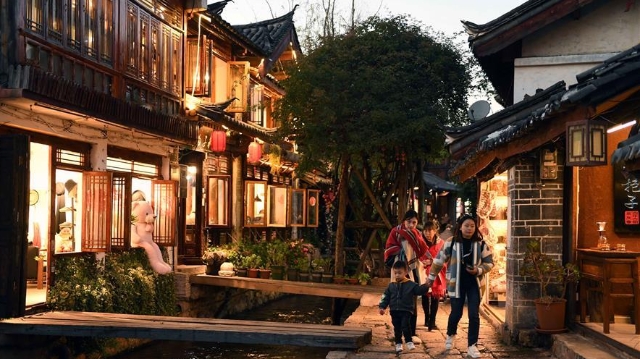 People watch performances at night in Lijiang ancient town, southwest China's Yunnan Province, Dec. 7, 2019. (Xinhua/Yang Zongyou)