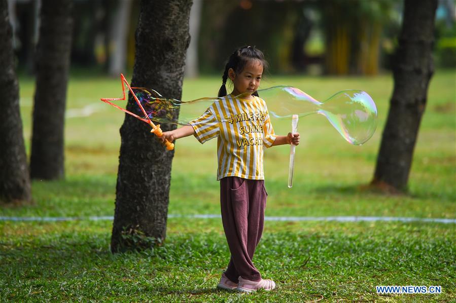 A child plays bubbles at Evergreen Park in Haikou, south China's Hainan Province, March 19, 2020. (Xinhua/Pu Xiaoxu)
