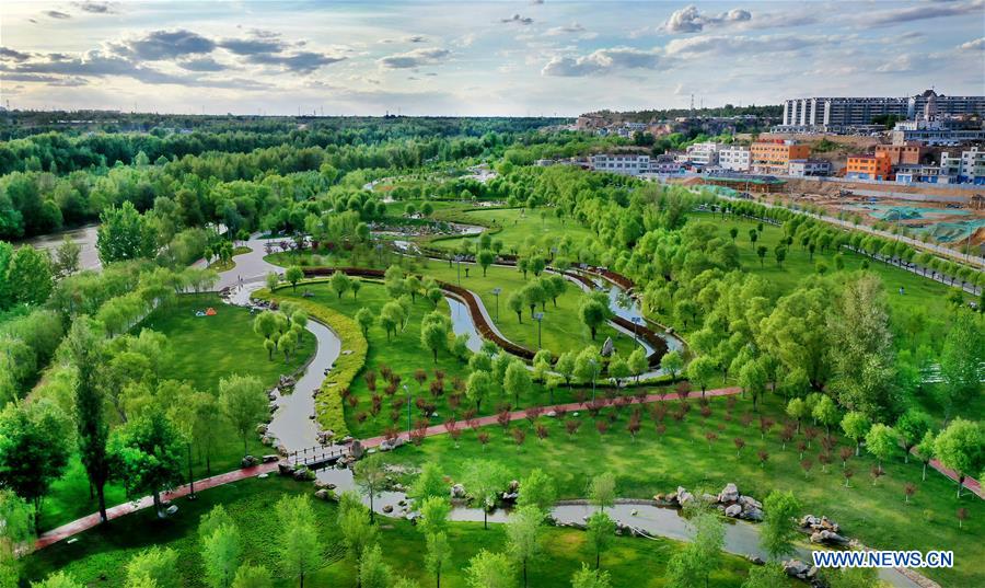 Aerial photo taken on May 24, 2020 shows a green belt along Yuxi River in Yulin City, northwest China's Shaanxi Province. Yulin City, which used to suffer from severe soil erosion and desertification, has been making efforts on afforestation since April, 2017. In November of 2019, the city was granted the status of National Forest City. (Xinhua/Tao Ming)