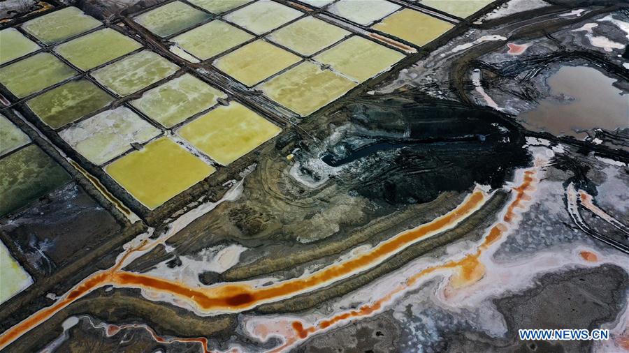 Aerial photo taken on May 31, 2020 shows Gouhu Lake, the biggest salt lake in Dingbian County, northwest China's Shaanxi Province. (Xinhua/Liu Xiao)