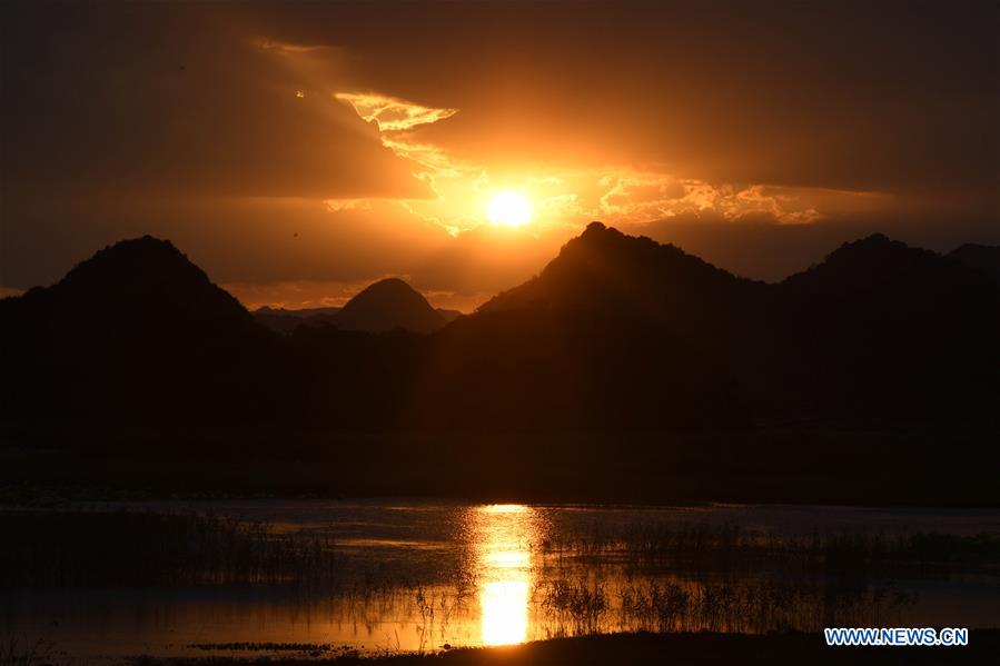 Photo taken on June 1, 2020 shows sunset scenery at the Puzhehei scenic area in Qiubei County, Wenshan Zhuang and Miao Autonomous Prefecture, southwest China's Yunnan Province. (Xinhua/Yang Zongyou)