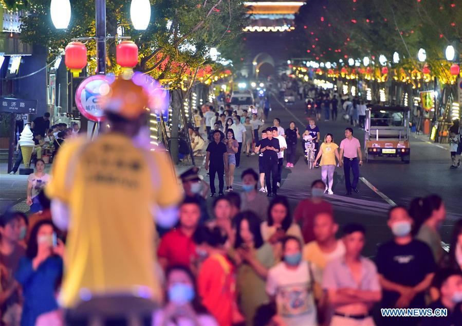People visit a historical street in the Zhengding ancient town in Zhengding County of Shijiazhuang, north China's Hebei Province, June 3, 2020. The Zhengding ancient town will gradually reopen its tourist attractions as the impact of COVID-19 ebbs away. Meanwhile, business activities under proper regulation are also encouraged as part of a government plan to revive the night-time economy. (Photo by Zhang Xiaofeng/Xinhua)