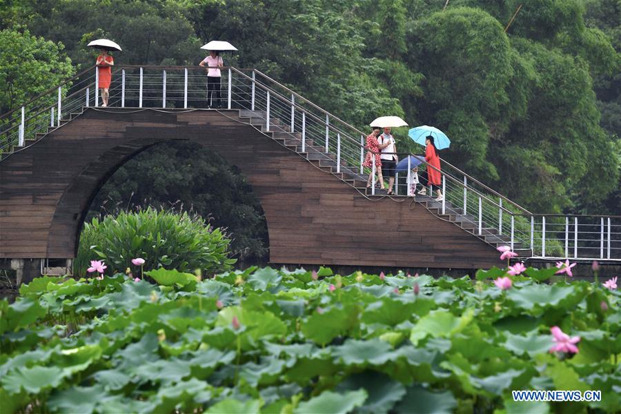 People visit the lotus flowers at the Jinshan Park in Fuzhou, capital of southeast China's Fujian Province, June 7, 2020. (Xinhua/Jiang Kehong)