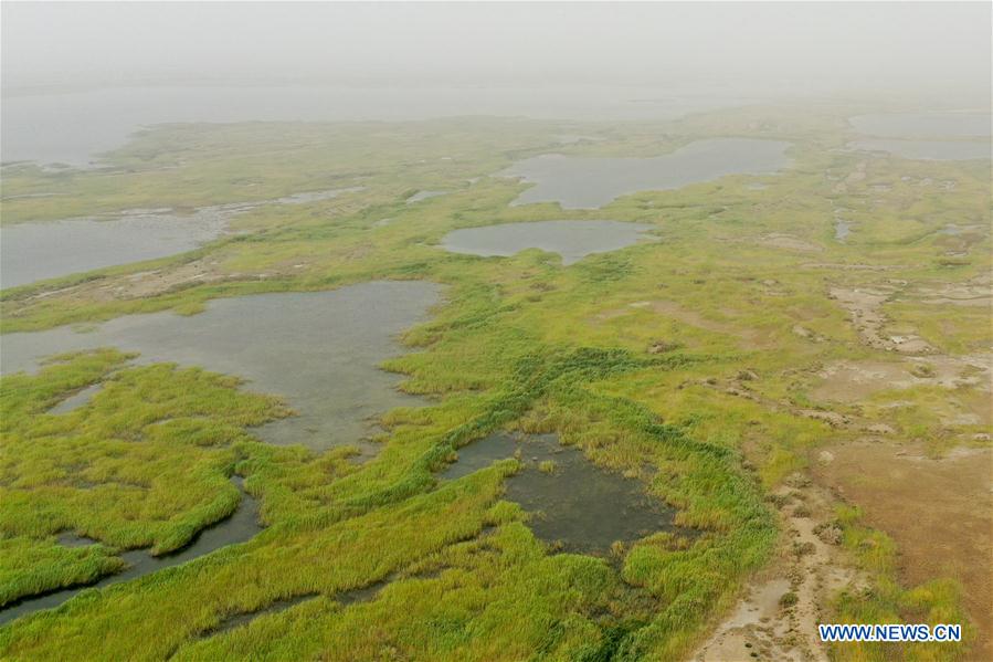 Aerial photo taken on July 16, 2020 shows the Taitema Lake in Ruoqiang County of northwest China's Xinjiang Uygur Autonomous Region. Taitema Lake, located at the end of the Tarim River, the largest inland river in China, has seen ecological improvement in recent years. (Xinhua/Ding Lei)