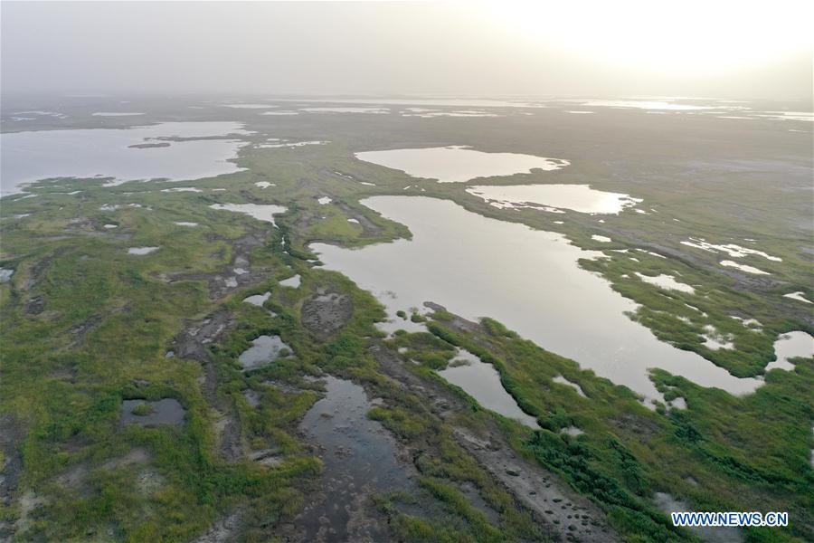 Aerial photo taken on July 16, 2020 shows the Taitema Lake in Ruoqiang County of northwest China's Xinjiang Uygur Autonomous Region. Taitema Lake, located at the end of the Tarim River, the largest inland river in China, has seen ecological improvement in recent years. (Xinhua/Ding Lei)