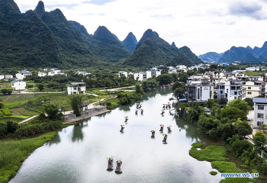 Aerial photo taken on Aug. 2, 2020 shows tourists rafting for sightseeing in Yulong River at Yangshuo County, Guilin City, south China's Guangxi Zhuang Autonomous Region. (Photo by Li Bin/Xinhua)