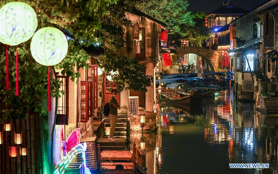 Photo taken on Sept. 27, 2020 shows tourist boats sailing on a canal amid decorative illuminations in the ancient town of Zhouzhuang in Kunshan, east China's Jiangsu Province. (Xinhua/Yang Lei)