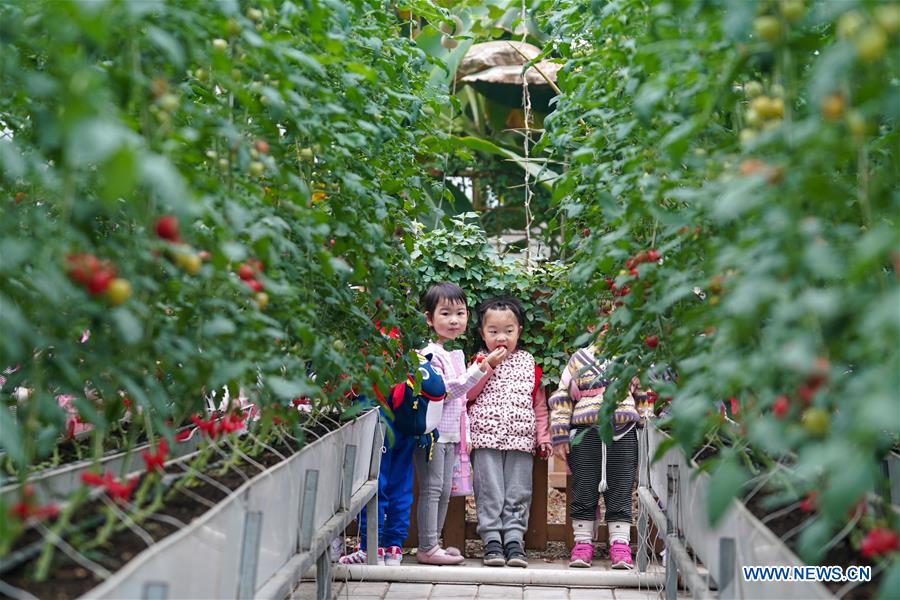 A group of children visit a modern agricultural industry park in Tongshan District, Xuzhou, east China's Jiangsu Province, Oct. 27, 2020. Authorities in Tongshan District have taken steps to optimize the local agricultural sector by combining modern agriculture with urban tourism. Altogether, the district's 300-plus agritourism parks have received some four million visitors in 2019. (Xinhua/Li Bo)