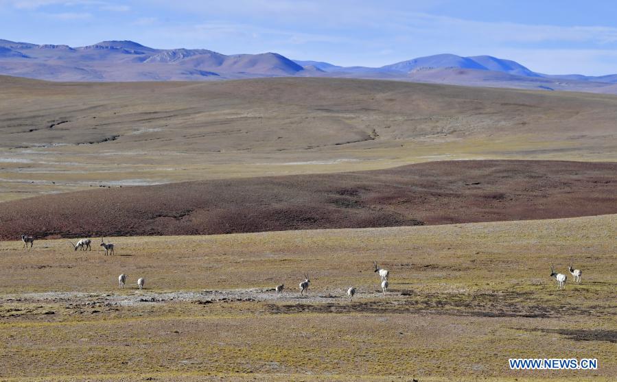 Tibetan antelopes forage on northern Tibetan plateau, southwest China's Tibet Autonomous Region, Jan. 16, 2021. (Xinhua/Zhang Rufeng)