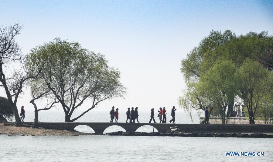 Tourists visit the Yuantouzhu scenic spot of the Taihu Lake in Wuxi, east China's Jiangsu Province, March 13, 2021. (Xinhua/Yang Lei)