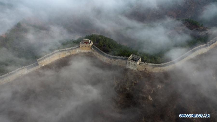 Aerial photo taken on March 13, 2021 shows cloud-shrouded Jinshanling Great Wall in Luanping County, north China's Hebei Province. (Photo by Wang Liqun/Xinhua)