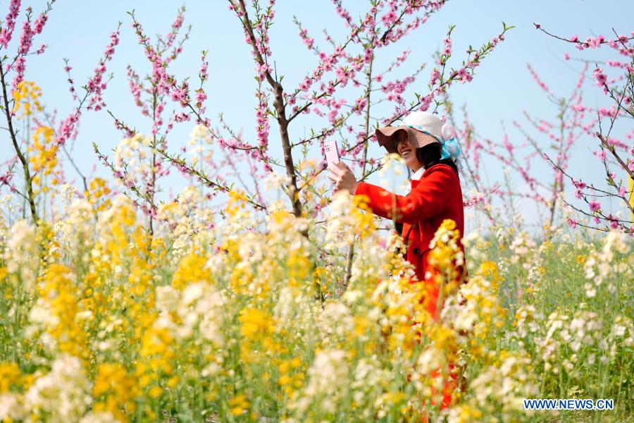 A tourist takes photos at an agricultural park in Sansheng Town of Beibei District, southwest China's Chongqing, March 13, 2021. (Photo by Qin Tingfu/Xinhua)