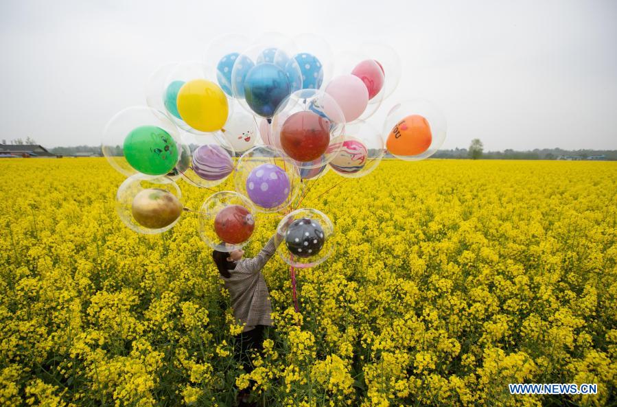 A woman poses for a photo amid cole flowers in Longquan Village of Xiushui Township in Anzhou of Mianyang, southwest China's Sichuan Province, March 14, 2021. Various measures such as organizing farming experience activities and promoting local specialties online and offline have been taken to achieve rural vitalization. (Xinhua/Jiang Hongjing)
