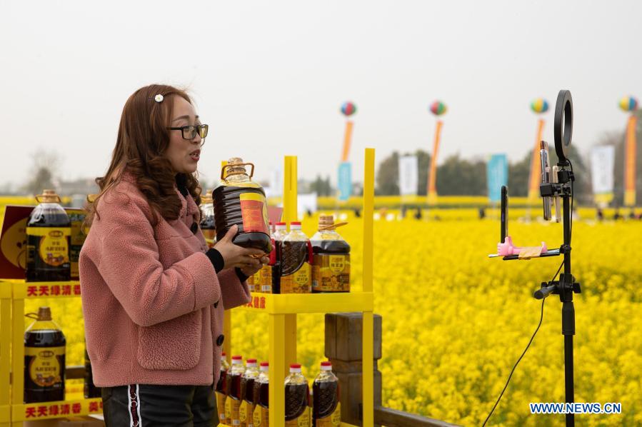 A staff member promotes and sells rapeseed oil via livestreaming amid cole flowers in Longquan Village of Xiushui Township in Anzhou of Mianyang, southwest China's Sichuan Province, March 14, 2021. Various measures such as organizing farming experience activities and promoting local specialties online and offline have been taken to achieve rural vitalization. (Xinhua/Jiang Hongjing)