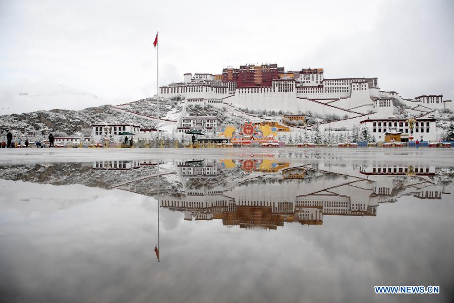 Photo taken on March 14, 2021 shows the snow scenery of Potala Palace in Lhasa, capital of southwest China's Tibet Autonomous Region. (Xinhua/Sun Ruibo)
