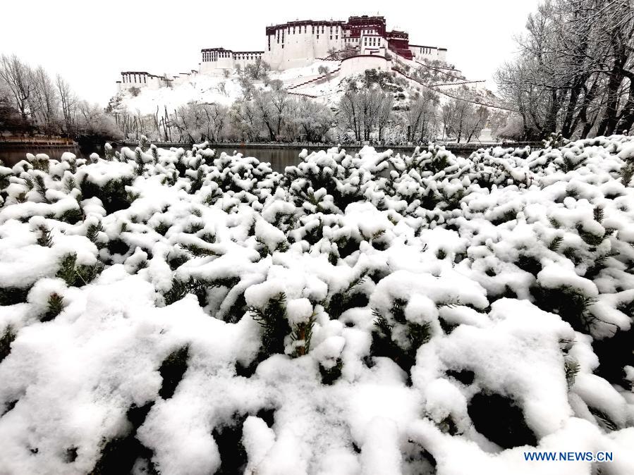 Photo taken on March 14, 2021 shows the snow scenery near the Potala Palace in Lhasa, capital of southwest China's Tibet Autonomous Region. (Xinhua/Chogo)