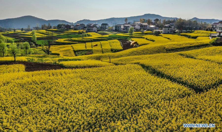 Photo taken on March 13, 2021 shows the cole flower fields in Hanzhong, northwest China's Shaanxi Province. (Xinhua/Tao Ming)