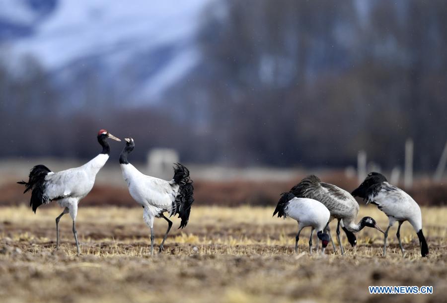 Photo taken on March 14, 2021 shows black-necked cranes foraging at the national nature reserve for black-necked cranes in Linzhou County of Lhasa, capital of southwest China's Tibet Autonomous Region. About 1,700 black-necked cranes arrive at the national nature reserve for black-necked cranes to spend the winter time every year. (Xinhua/Zhang Rufeng)