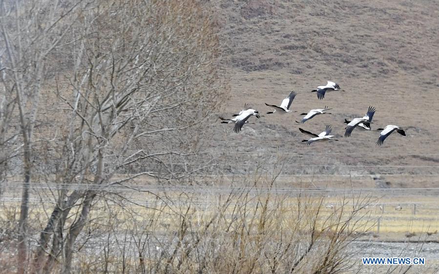 Photo taken on March 14, 2021 shows black-necked cranes flying at the national nature reserve for black-necked cranes in Linzhou County of Lhasa, capital of southwest China's Tibet Autonomous Region. About 1,700 black-necked cranes arrive at the national nature reserve for black-necked cranes to spend the winter time every year. (Xinhua/Zhang Rufeng)