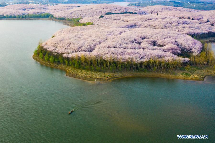 Aerial photo taken on March 15, 2021 shows the scenery of cherry blossoms in Gui'an New District, southwest China's Guizhou Province. (Xinhua/Ou Dongqu)