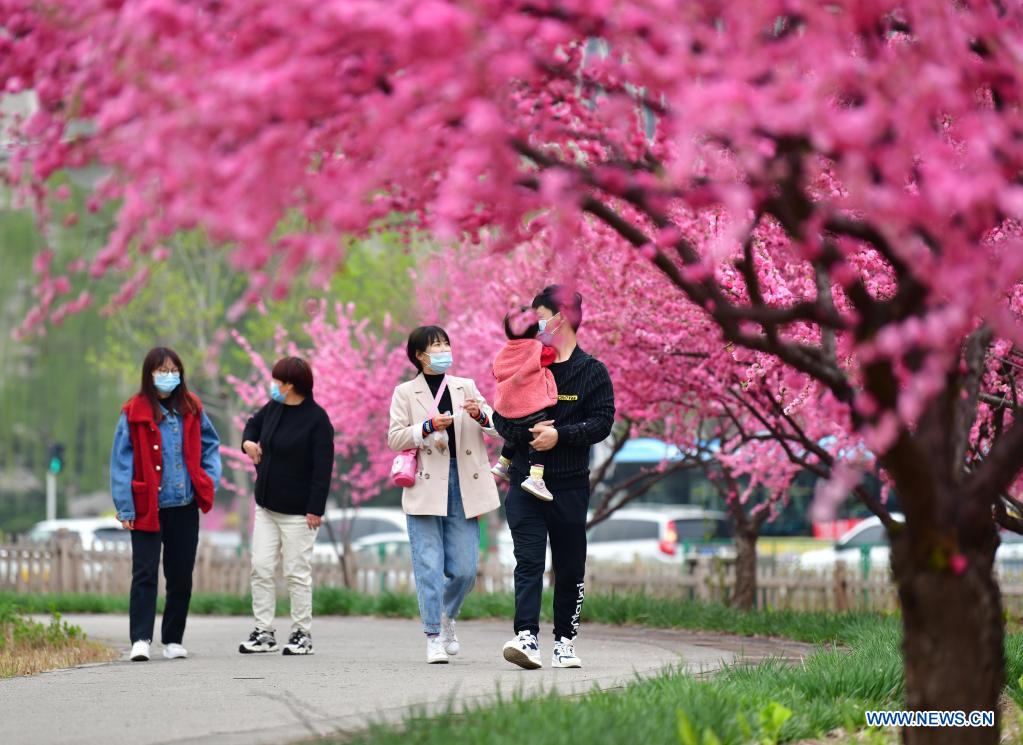 Tourists enjoy flowers at Huangtaishan Park in Qian'an City, north China's Hebei Province, April 11, 2021. Flowers are in full bloom in Huangtaishan Park, attracting many tourists. (Xinhua/Li He)