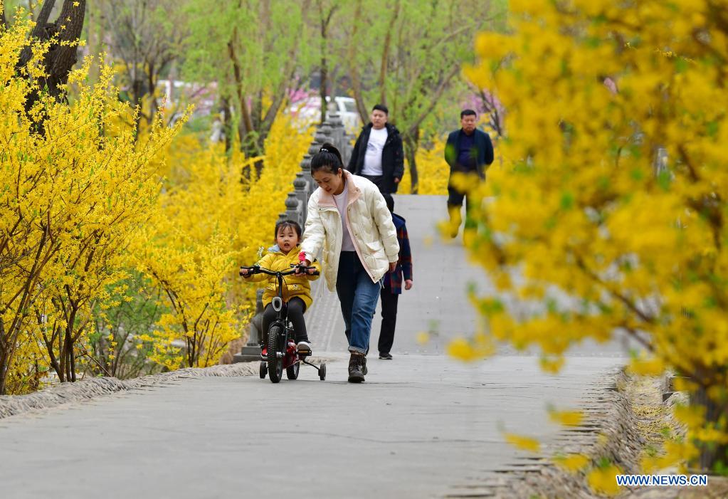 Tourists enjoy flowers at Huangtaishan Park in Qian'an City, north China's Hebei Province, April 11, 2021. Flowers are in full bloom in Huangtaishan Park, attracting many tourists. (Xinhua/Li He)