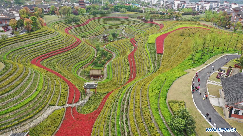 Aerial photo taken on April 14, 2021 shows tourists visiting terraced fields in Shexiang ancient town in Dafang County of Bijie, southwest China's Guizhou Province. (Xinhua/Yang Ying)