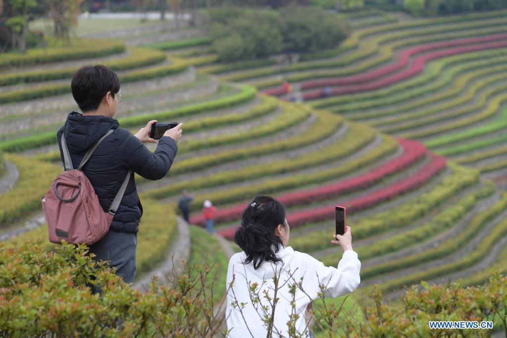 Tourists visit terraced fields in Shexiang ancient town in Dafang County of Bijie, southwest China's Guizhou Province, April 14, 2021. (Xinhua/Yang Ying)