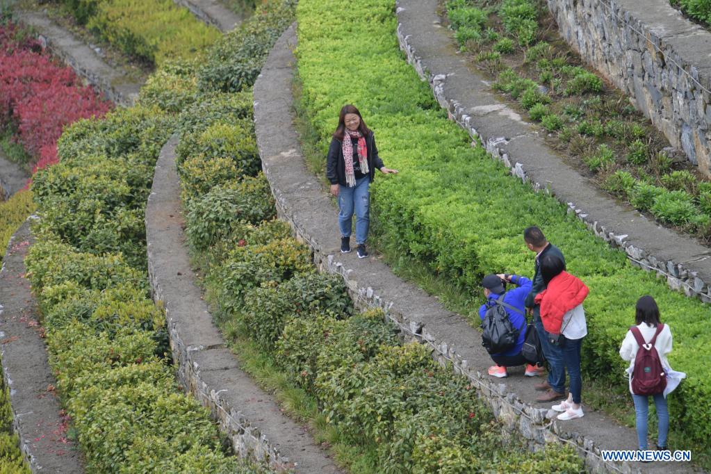 Tourists visit terraced fields in Shexiang ancient town in Dafang County of Bijie, southwest China's Guizhou Province, April 14, 2021. (Xinhua/Yang Ying)