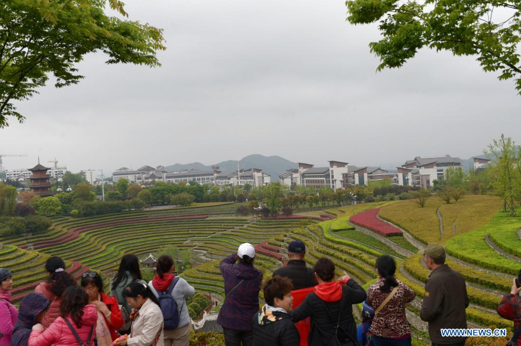 Tourists visit terraced fields in Shexiang ancient town in Dafang County of Bijie, southwest China's Guizhou Province, April 14, 2021. (Xinhua/Yang Ying)