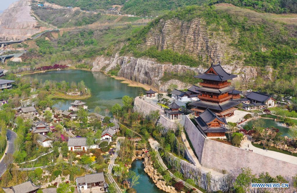 Aerial photo taken on April 15, 2021 shows the Garden Expo Park in Jiangning District of Nanjing, east China's Jiangsu Province. The 11th Horticultural Exposition of Jiangsu Province opened in Jiangning, Nanjing, on Thursday. Jiangsu Garden Expo Park is built on abandoned mine pits. Through the revitalization of industrial remains, the once abandoned mine has become an urban oasis where man and nature coexist harmoniously. (Xinhua/Ji Chunpeng)