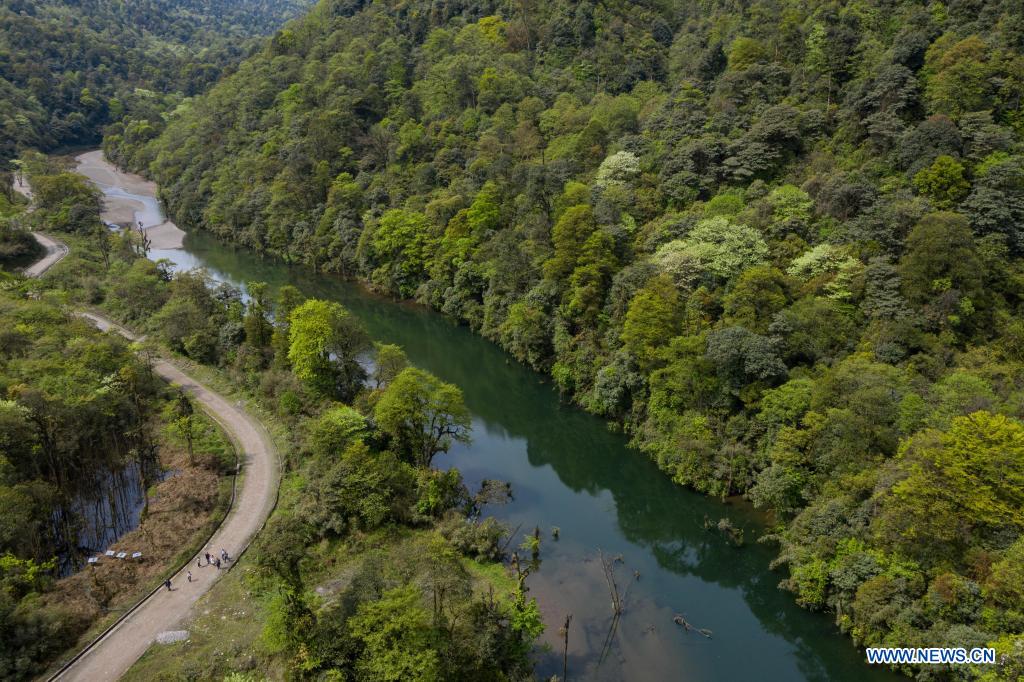 Aerial photo taken on April 18, 2021 shows hikers walking along a section of ancient Tea Horse Road of Daxiangling in Yingjing County, southwest China's Sichuan Province. Yingjing County has been trying to promote its tourist industry by taking advantage of its rich forest resources. (Xinhua/Jiang Hongjing)