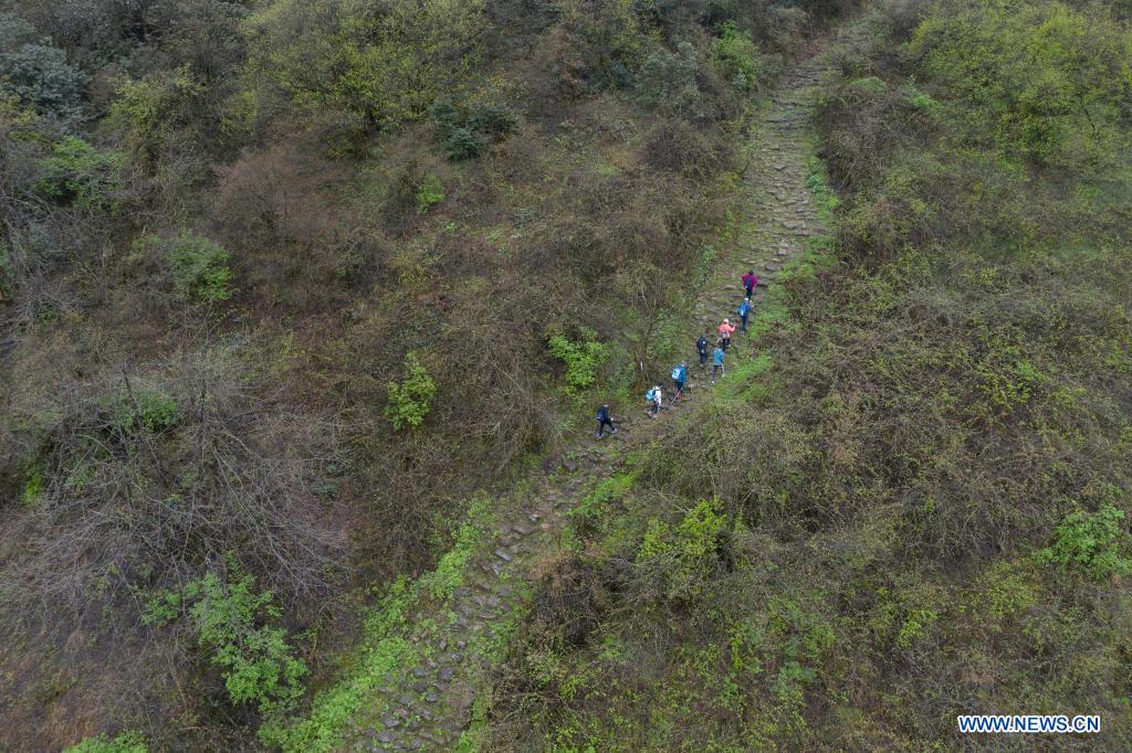 Aerial photo taken on April 18, 2021 shows hikers walking along a section of ancient Tea Horse Road of Daxiangling in Yingjing County, southwest China's Sichuan Province. Yingjing County has been trying to promote its tourist industry by taking advantage of its rich forest resources. (Xinhua/Jiang Hongjing)