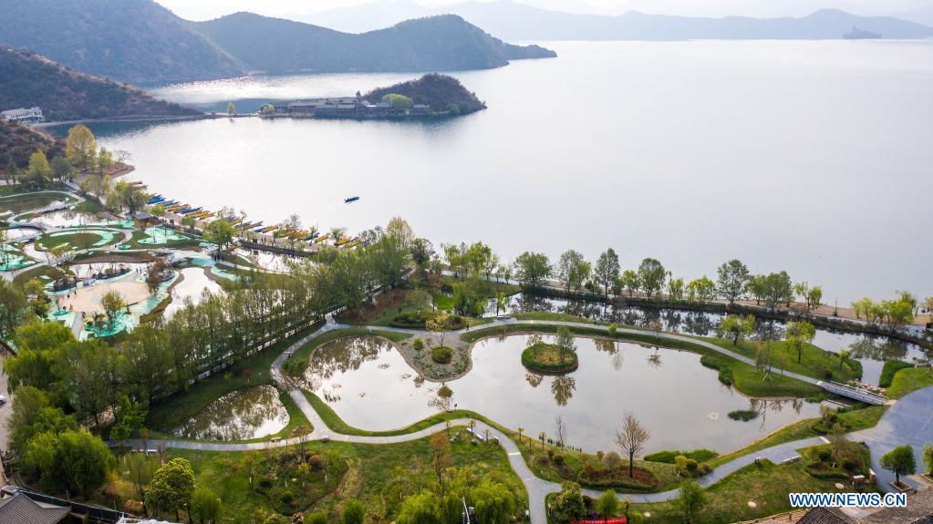 Aerial photo taken on April 17, 2021 shows a lakeside ecological belt construction and wetland restoration project by Lugu Lake in Lige Village, Yongning Town, Ninglang Yi Autonomous County, in southwest China's Yunnan Province. Bordering Sichuan province, Lugu is the highest lake in Yunnan, standing about 2,700 meters above sea level and surrounded by forest-clad mountains. Known as the "sparkling pearl embedded in the highland", Lugu Lake plays a key role in balancing the local environment. Lugu Lake has seen improved water quality in recent years amid continuous ecological restoration efforts in the fields of water protection, pollution prevention and control, and ecological restoration in the basin. Water quality in the lake has maintained Grade I for years, the highest level in China's water grading system. (Xinhua/Hu Chao)
