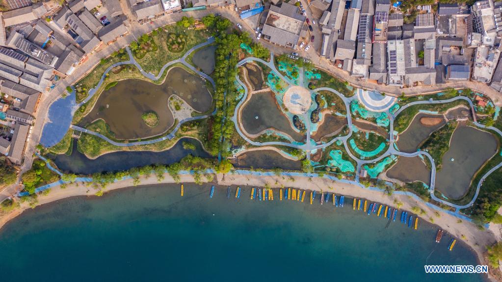 Aerial photo taken on April 17, 2021 shows a lakeside ecological belt construction and wetland restoration project by Lugu Lake in Lige Village, Yongning Town, Ninglang Yi Autonomous County, in southwest China's Yunnan Province. Bordering Sichuan province, Lugu is the highest lake in Yunnan, standing about 2,700 meters above sea level and surrounded by forest-clad mountains. Known as the "sparkling pearl embedded in the highland", Lugu Lake plays a key role in balancing the local environment. Lugu Lake has seen improved water quality in recent years amid continuous ecological restoration efforts in the fields of water protection, pollution prevention and control, and ecological restoration in the basin. Water quality in the lake has maintained Grade I for years, the highest level in China's water grading system. (Xinhua/Hu Chao)