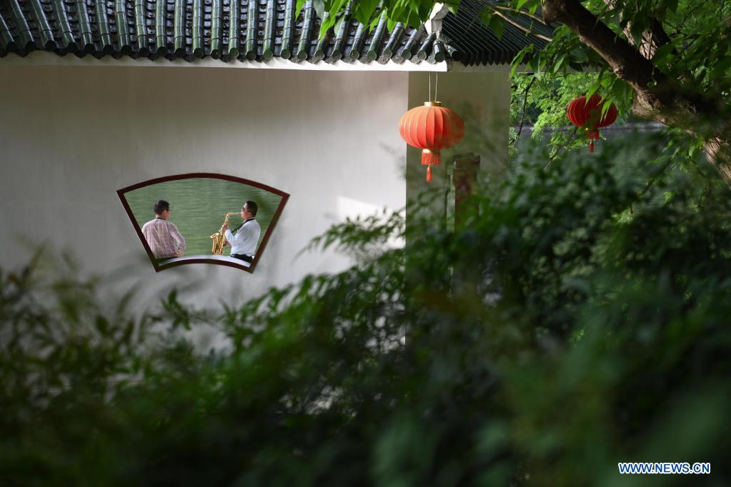 A man plays the saxophone in Huancheng Park in Hefei, capital of east China's Anhui Province, May 5, 2021. (Xinhua/Zhang Duan)