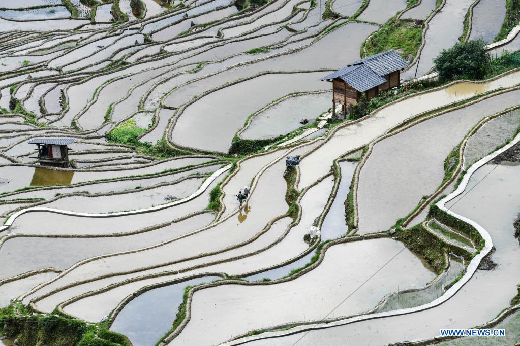 Farmers walk in the terraced fields in Congjiang County, southwest China's Guizhou Province, May 3, 2021. (Xinhua/Yang Wenbin)