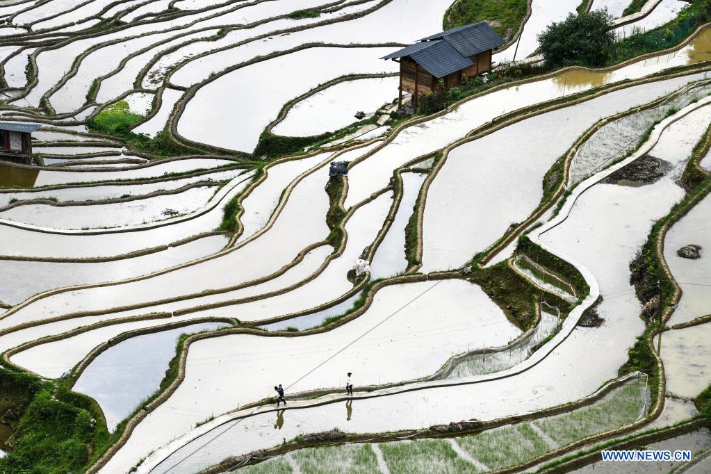 People walk in the terraced fields in Congjiang County, southwest China's Guizhou Province, May 3, 2021. (Xinhua/Yang Wenbin)