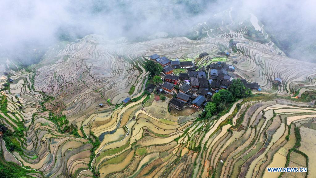 Aerial photo taken on May 4, 2021 shows the terraced fields in Congjiang County, southwest China's Guizhou Province. (Xinhua/Yang Wenbin)