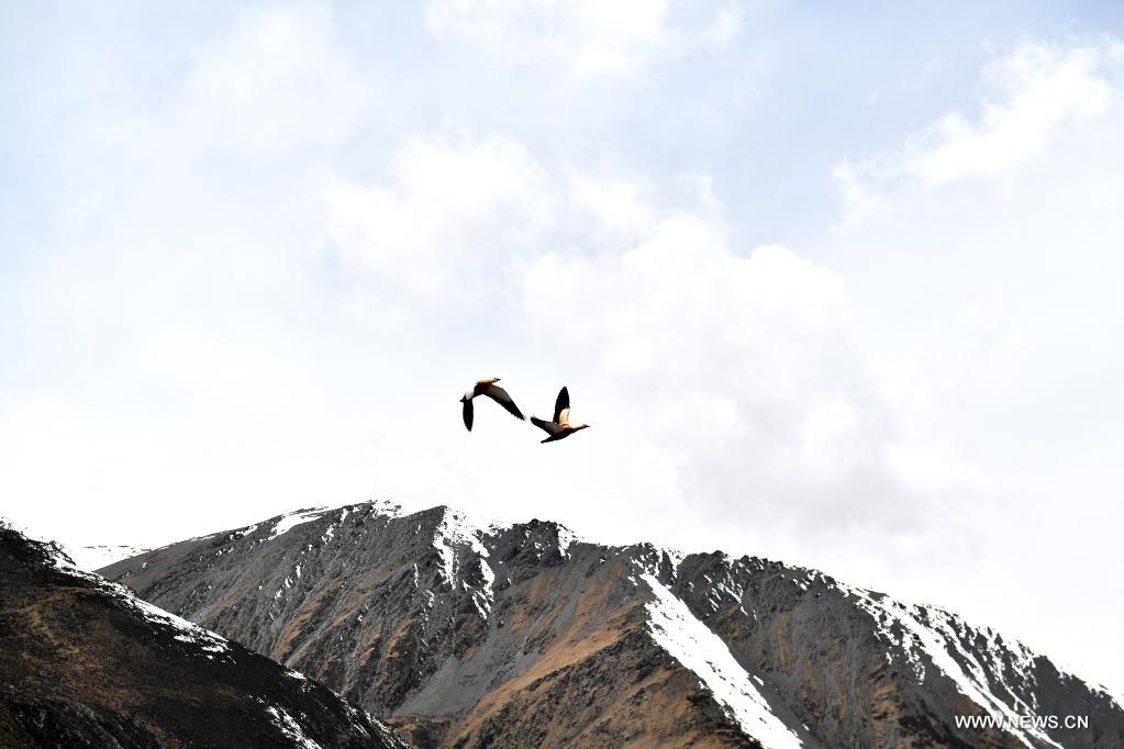 Birds fly around the Sapukonglagabo Mountain in Biru County of Nagqu, southwest China's Tibet Autonomous Region, May 4, 2021. (Xinhua/Sun Ruibo)