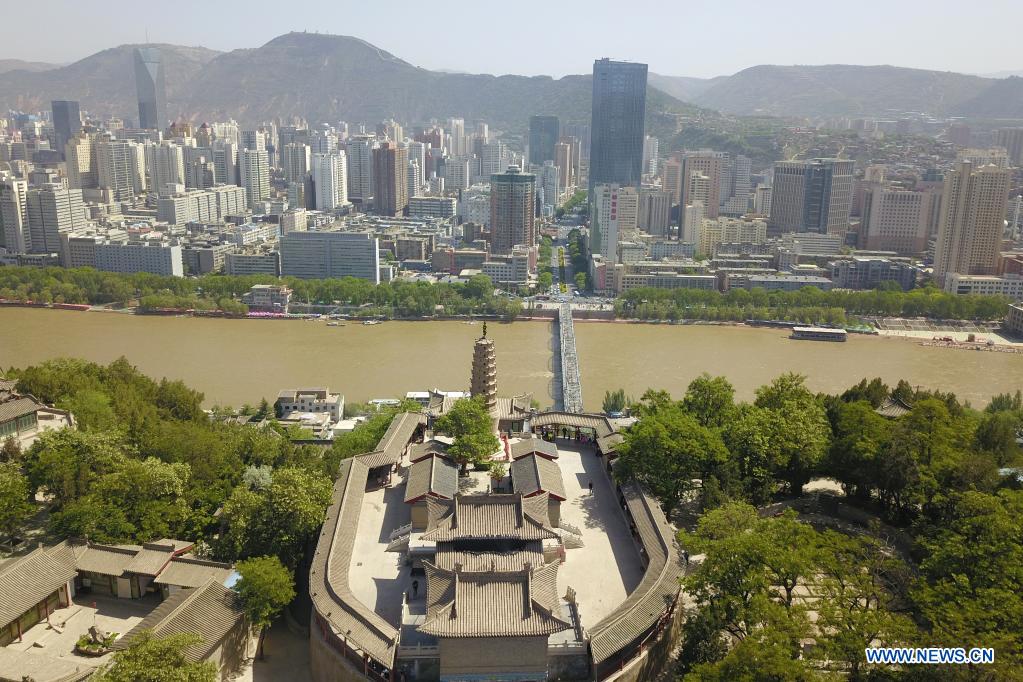 Aerial photo taken on May 8, 2021 shows a section of the Yellow River in Lanzhou, capital of northwest China's Gansu Province. The Yellow River, China's second-longest waterway, is dubbed a "mother river" in the country. The river flows through nine provincial-level regions, supplying water to 12 percent of China's population. With the mainstream of the river running through, Lanzhou has a profound bond with the river. Around 35 years ago, a sculptor named He E designed a statue to express her deep love to the mother river. The statue, named as "Yellow River -- the Mother," is her masterpiece and becomes a local resort along the riverside. (Xinhua/Fan Peishen)
