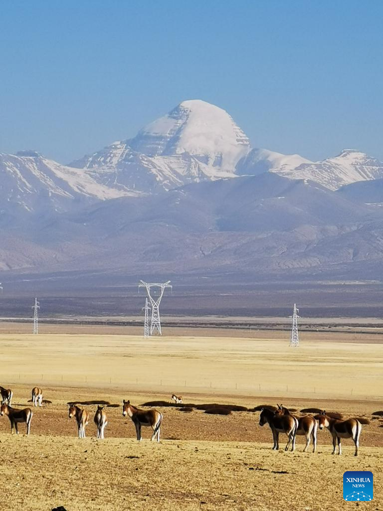 Photo taken with a mobile phone shows a herd of Tibetan wild donkeys in Burang County, southwest China's Tibet Autonomous Region, April 7, 2022. Tibet has become an ideal habitat for wild animals over the years amid the region's thriving biodiversity protection endeavors.